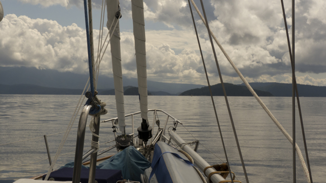 Well we finally got away from Nanaimo. We’ve got the broken stanchions lashed up, and the sails tied down–we’re supposed to head to a harbour near Victoria for an inspection of the damages–ordered up the insurance surveyor, and we’re not supposed to sail except in an emergency. So we’re pretending to be trawler, Marike jokes. And of course, today, there was wind!