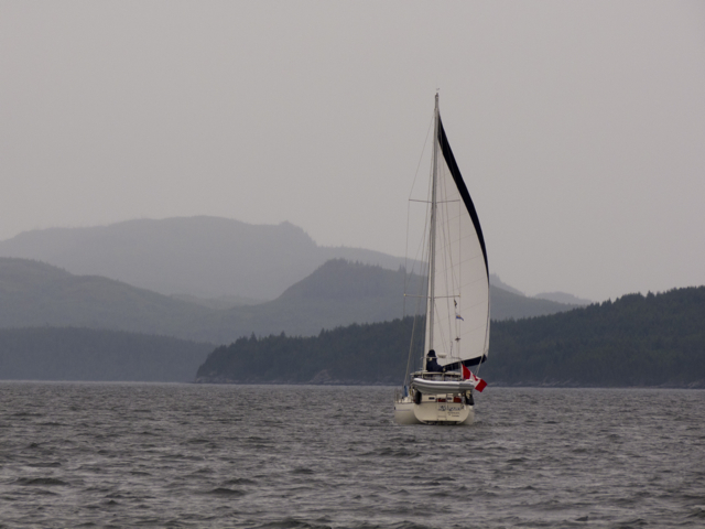It smirked at us, almost smiled, but did not bare its teeth. We raised the jib and motorsailed through the short choppy grey waves and a blue landscape–blue hills, blue-grey skies, a watercolour mist, then rain. Alongside us, gulls hitched a ride on breakaway logs from a boom and then, near the Broken Islands, we passed through a leaping school of dolphins.