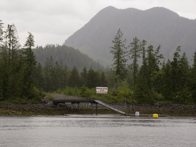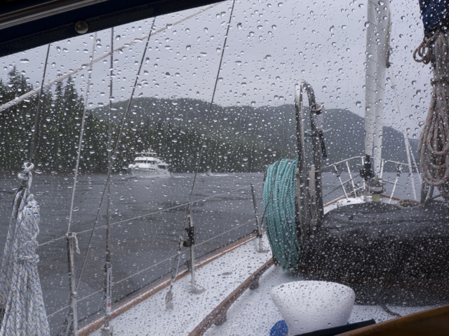 Cutter Cove was nearby, around the corner from a dockside sign reading Chatham Channel Post Office and General Store. We crept into the cove and dropped anchor in the rain. Debris from an old logging operation cluttered the beach; above us stone walls loomed and dripped.