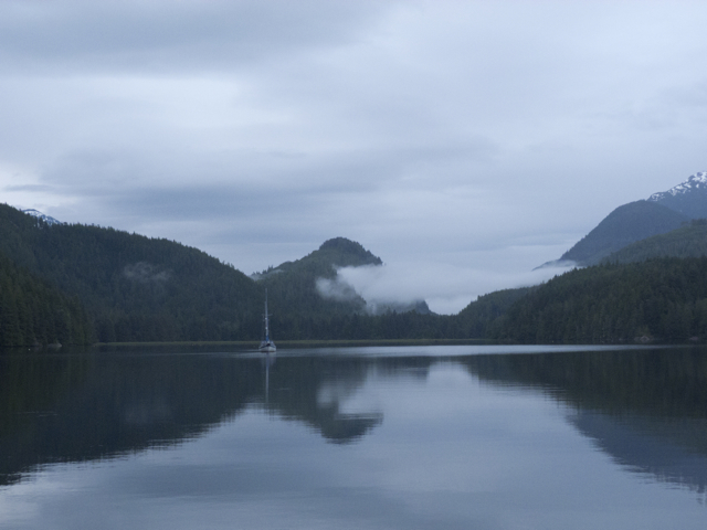 When we woke the world was bathed in a grey wash–pale sky, steely water, grey green hills, granite cliffs. We raised the anchor and slipped out of Forward Harbour and into the Sunderland Channel. We motored past mountains and islands and clearcuts and fish farms in virtually every bay; the more stunning the view, the more certain we could be that we would see multiple modes industrial exploitation and resource extraction. And then suddenly we were at the edge of the infamous Johnstone Strait.