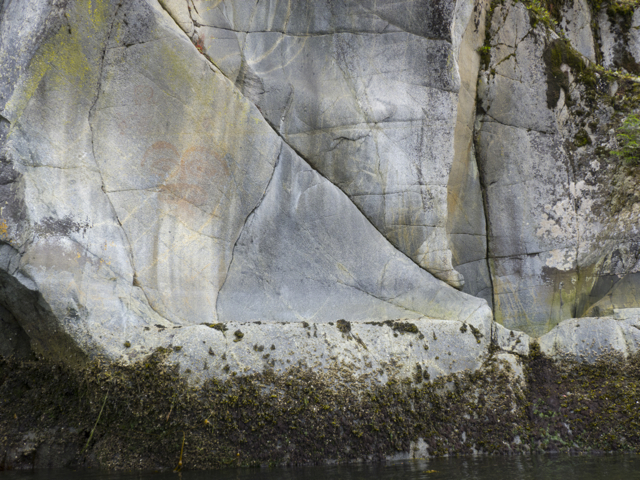 Then, as we nosed along, chilly in the northwest wind and chop, we saw an indentation that did indeed look a bit like a bathtub, a hollowed-out bowl in the rock wall. We imagined it might fill at high tide, warm in the sun, and serve as a welcome bathing spot for someone—a bird perhaps, or an otter, even a full-grown person. And there beside it was the pictograph!