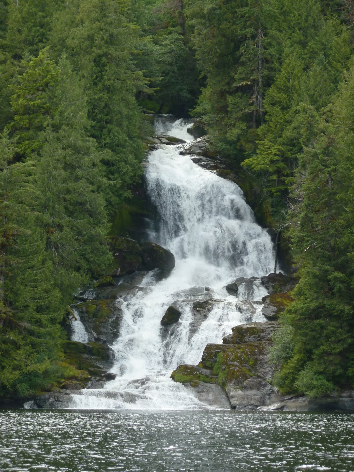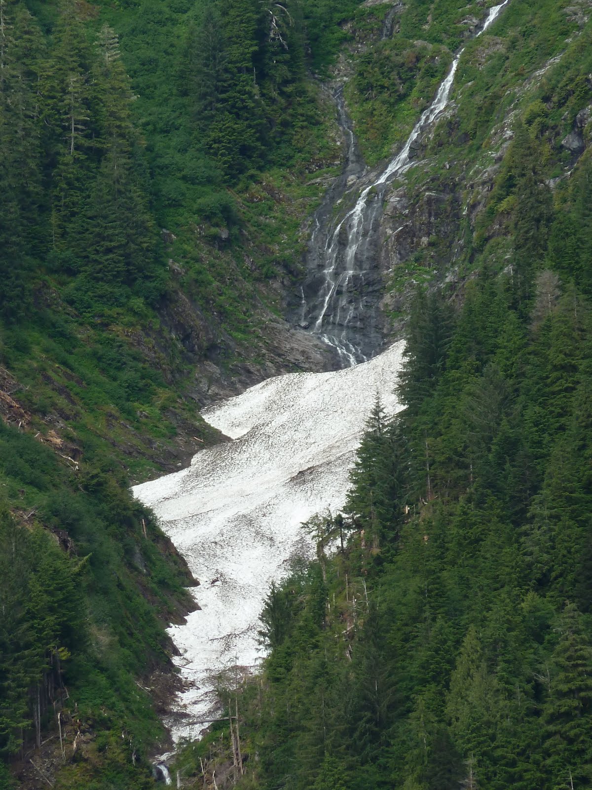 All around us, snowy peaks glittered in the sun. We watched for bears, but only spotted seals chasing leaping salmon; we saw and heard eagles, gulls and ravens. Everywhere, the sound of running water. Cascades poured down the mountains from snowy patches or lakes at high elevations. Whirlpools twisted around the boat, but the current held us in place.