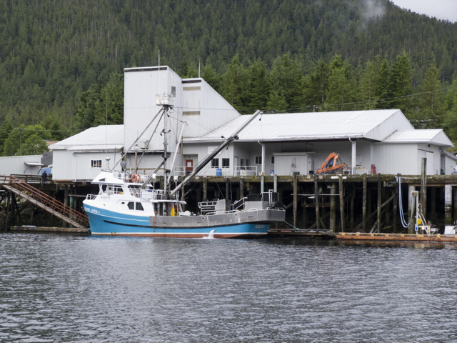 We had intended to stop at Klemtu village to see the town and take on water, but could not sort out where we could dock. Several sailing vessels were pulled in to a dock near shore, but there didn’t seem to be room for another boat; a little further along we saw a large wharf and buildings that belonged to Ocean Harvest, a Norwegian open pen salmon feedlot operation. It looked like fish were offloaded here from nearby pens and processed for shipping out on the ferry.