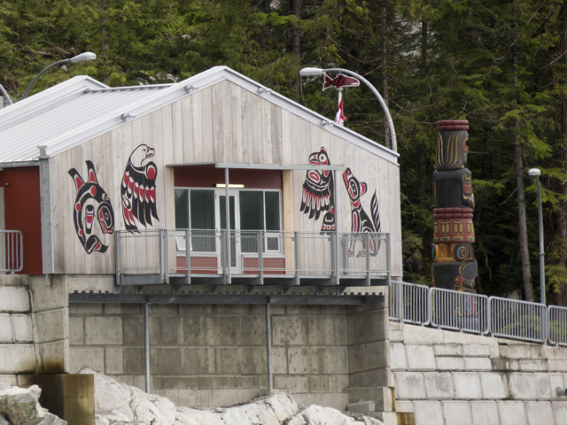 The village is home to around 500 people who are descended from the Kitasoo tribe of Tsimshians, originally from Kitasu Bay, and the Xai’xais of Kynoc Inlet, who are Heiltsuk. Residents of Klemtu live together as the Kitasoo/Xai’xais Nation, which is a member of the Oweekeno-Kitasoo-Nuxalk Tribal Council. Apparently, Klemtu gets its name from “klemdoo-oolk,” a word which means “impassable” in the Coast Tsimshian language, though whether this refers to the steepness of the terrain, the narrowness of Klemtu Passage, which runs between Swindle Island, where the village is located, and Cone Island, or the sometimes dense fog we saw there, we couldn’t say.
