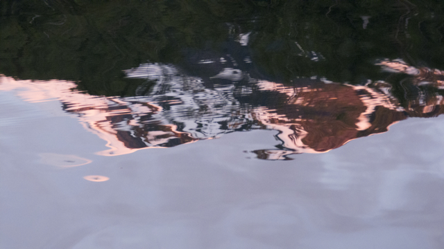 At sunset, light tumbled from the clouds and over the peaks, illuminating first one, then another, then winking out. And then another ray fingered out, tossing a rosy wash over snow and rocks and trees. Water and valleys dropped gradually into darkness; at 9:45 pm, just the heights were aglow. Tide and current went slack. Soon, we thought, the light would fade and we would turn. Night.
