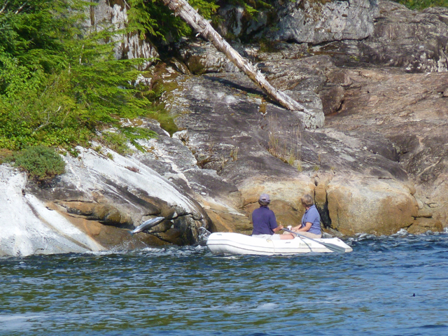Marike decided to launch the dinghy and troll for salmon.  She set up a flasher and a hoochie with two barbless hooks; Karin got the net, the shot hammer (our instrument of death) and the bucket, and climbed into the dinghy to row.