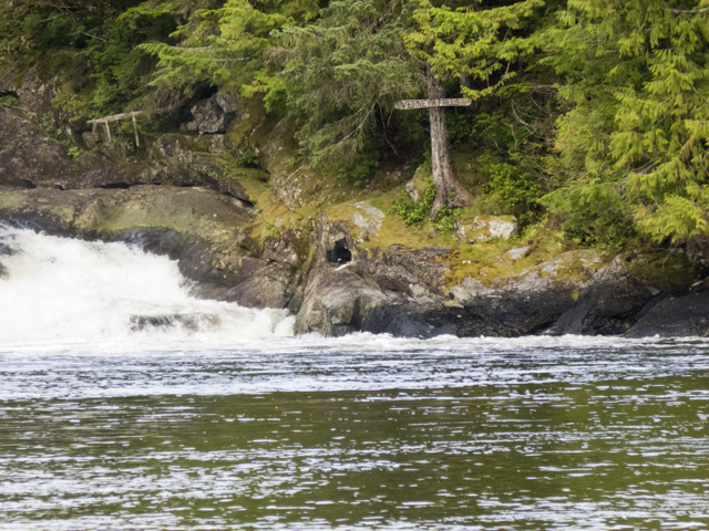 For later, once we settled enough to consult our guide to the fishing regulations, we realized that we were not in a legal fishing zone: “Area 5. All finfish including salmon.  Inside a line drawn from fishing boundary signs located approximately 100 meters seaward of the falls at the mouth of the Kumowdah River flowing into Lowe Inlet, is closed to fishing for all finfish July 1- October 31.”  Whoops. So that’s what those triangular signs meant. Novice fishermen are a confused lot. Now we get it—we were in a BC Marine Park. And First Nations territorial waters. And the Kumowdah River is an important spawning grounds. No fishing by humans allowed.