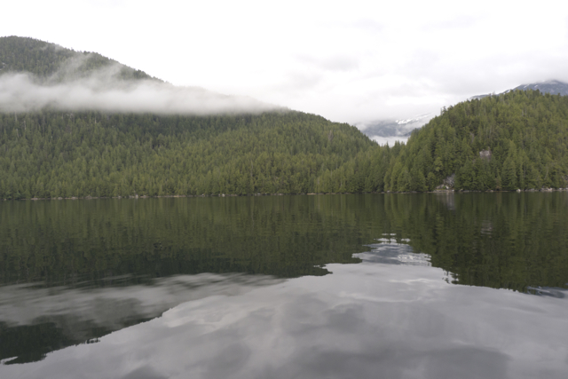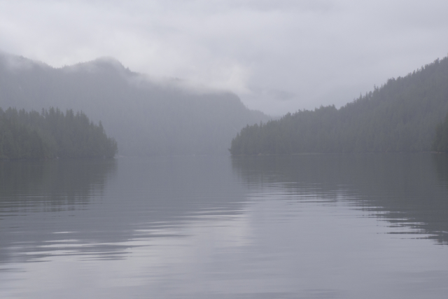 Grenville Channel is a straight narrow deep chasm that runs some 45 miles northwest from Wright Sound almost all the way to Prince Rupert, part of the Inside Passage to Alaska. So straight and so narrow (just 500-600 meters wide in places) is the channel that it seems a human-made passage, a canal, which is, indeed, how it is used by vessels both large and small.  But it is also deep (deeper than 90 meters in most places) and surrounded by peaks that rise to 3500 meters; digging this groove was a glacial, not human-powered feat.