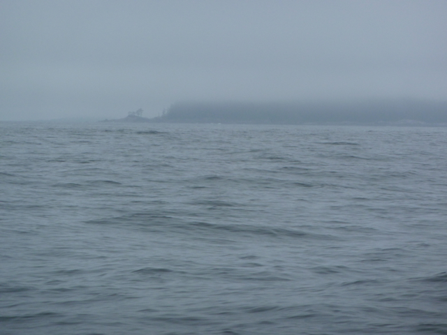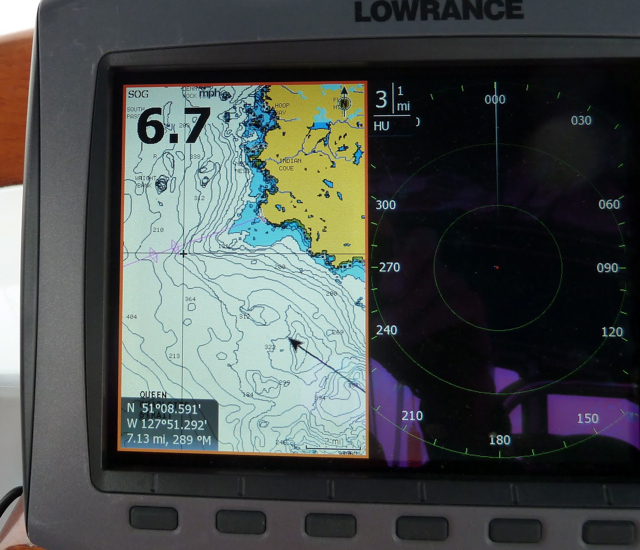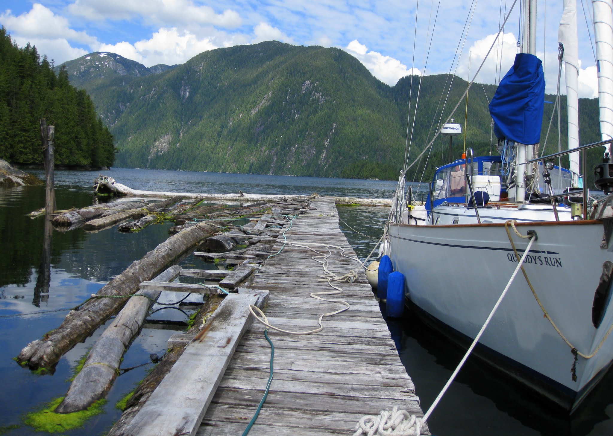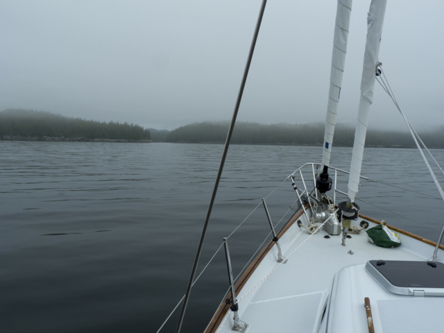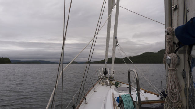 On July 1st, Canada Day, we set out from Goat Island for Echo Bay with our regalia flying from the rigging and a large wind-ripped Canadian flag on which we had written “take back our country” hung at eye level on a shroud. We followed the instructions for making our way there carefully: head through Spring Passage, up Retreat Passage–beware of Brown Rock, head close to the point and turn, staying close to Isle Point before entering Cramer Passage– to Echo Bay. Many motor yachts passed us, heading to Echo Bay for the Canada Day BBQ at Pierre’s Marina and Lodge, famous for its pig and prime rib roasts. We were glad to see so much activity for a local business, but decided to head towards Shoal Bay and look up Alexandra Morton at her research station there.