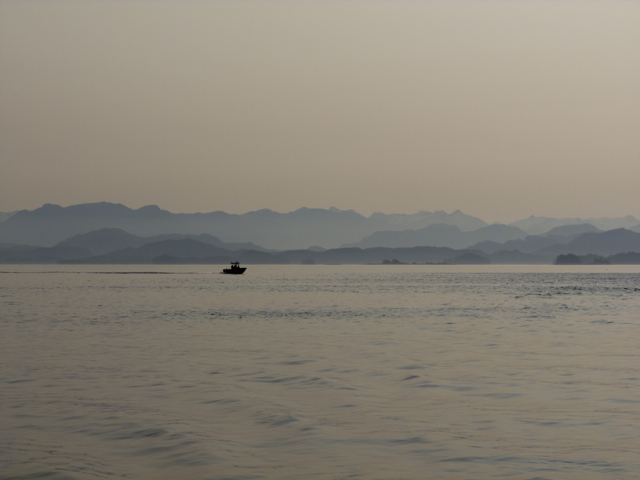 One of our aims for the summer of 2012 was to visit the area where the mainland tilts in closely towards the northern end of Vancouver Island—the Broughton Archipelago—host to huge Norwegian fish farms for twenty or so years now. We wanted to meet with Alex Morton to discuss what was happening in BC, to learn some strategies for self-defence, and to visit alternative fish rearing projects being piloted in a couple of communities, both in-water and on-land closed containment sites. By late June, we were finally in the Broughton, and headed for Alexandra Morton’s home base, Echo Bay.