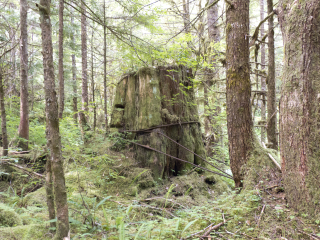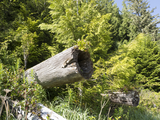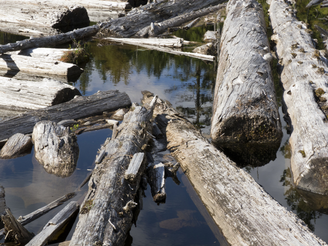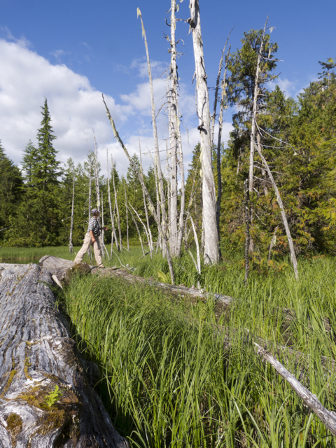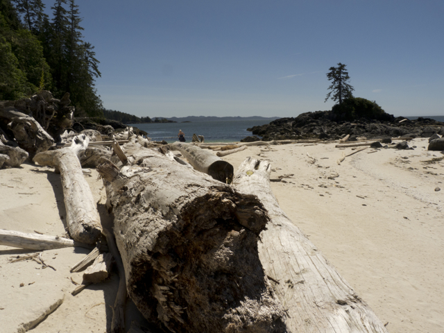 We climbed up a steep path over large roots, around enormous red trunks, over rocks and fallen trees; we balanced across a log over a deep hole, jumped from tree trunk to tree trunk; we slipped, slid, slouched through mud, hung onto trees, shook off the water, studied bear and cougar scat, examined long strips where bears had torn bark from the trees in search of insects and sap; then slid greasy red step by muddy step, down into the little cove of Echo Bay, rain streaming from our coats and hoods, water pooling in our boots, Elisabeth gamely keeping pace with us.