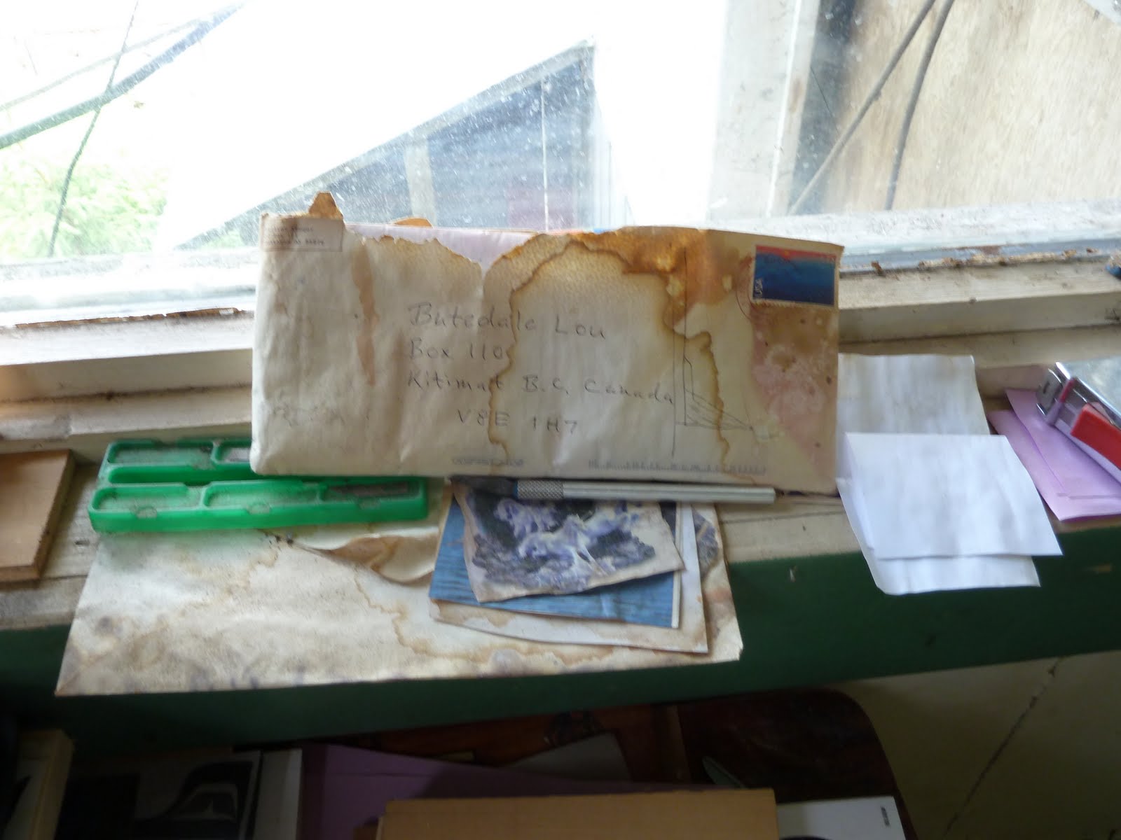 The morning after our dinner, M.J. volunteered to guide us over the hill and through the woods to Billy Proctor’s establishment. It was pouring rain; every surface was cedar coloured, damp and slippery. Huge curtains of moss were beaded with water; rain dripped on our heads and down our necks. M.J. carried a bear-banger because the woods were rife with bear and cougar. As we walked, she told us about an evening run on a nearby logging road when she’d been stalked by a cougar. Very terrifying.